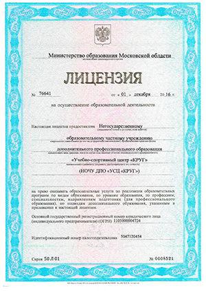 Бланк серия 50 Л01 № 0008521 лицензия № 76641 от 01.12.2016 выдана Министерством образования Московской области, срок действия – бессрочно (НОЧУ ДПО "УСЦ "КРУГ").